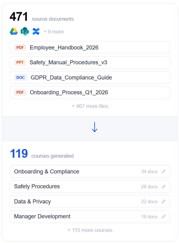 Upload your existing SOPs, policies, onboarding materials, and compliance content.